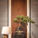 Một trong những yếu tố nổi bật của phòng khách này là cây bonsai nghệ thuật, được đặt trên bàn hoặc góc tường, tạo nên một không gian mang đậm hơi thở thiên nhiên. Ngoài ra, những loại cây nhỏ như hoa lan, cây lưỡi hổ hay bàng Singapore cũng được sử dụng để làm mềm không gian, giảm bớt sự cứng nhắc của các đường nét nội thất.