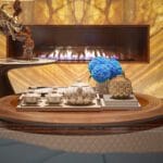 Bên cạnh đó, hệ thống đèn chiếu sáng cũng được bố trí hợp lý, giúp tôn lên các đường nét của nội thất và làm nổi bật vẻ đẹp tự nhiên của gỗ và cây xanh. Đèn chùm pha lê được sử dụng để tạo điểm nhấn ở khu vực trung tâm, mang lại sự ấm cúng và tăng thêm tính thẩm mỹ cho toàn bộ không gian.