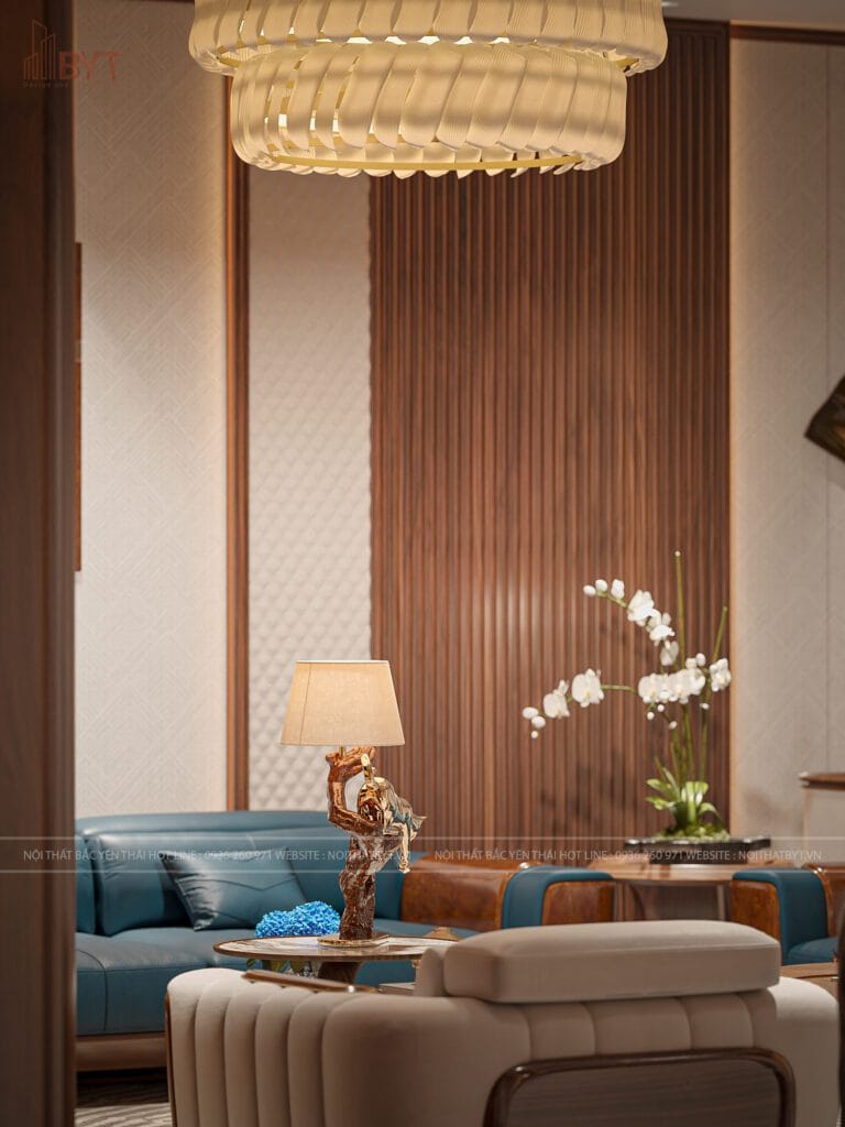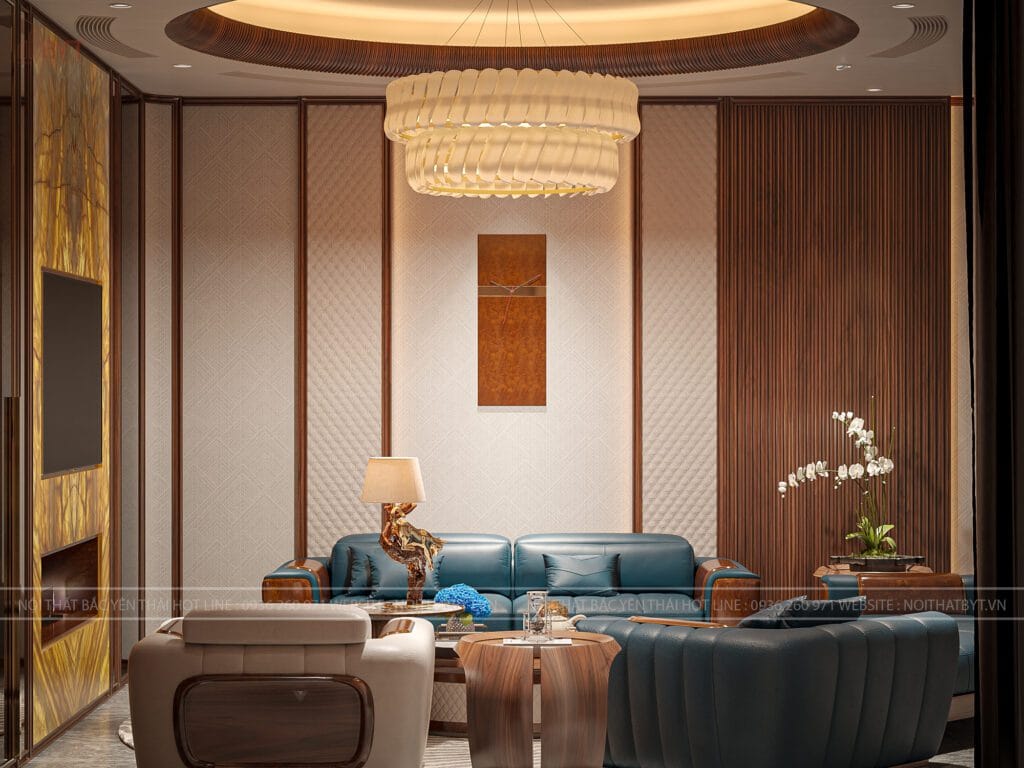 Màu sắc là yếu tố quan trọng tạo nên sự hài hòa trong thiết kế nội thất phòng khách. Trong thiết kế này, bảng màu chủ đạo là sự kết hợp giữa nâu gỗ trầm ấm và xanh biển sang trọng, tạo nên không gian vừa ấm áp vừa hiện đại.