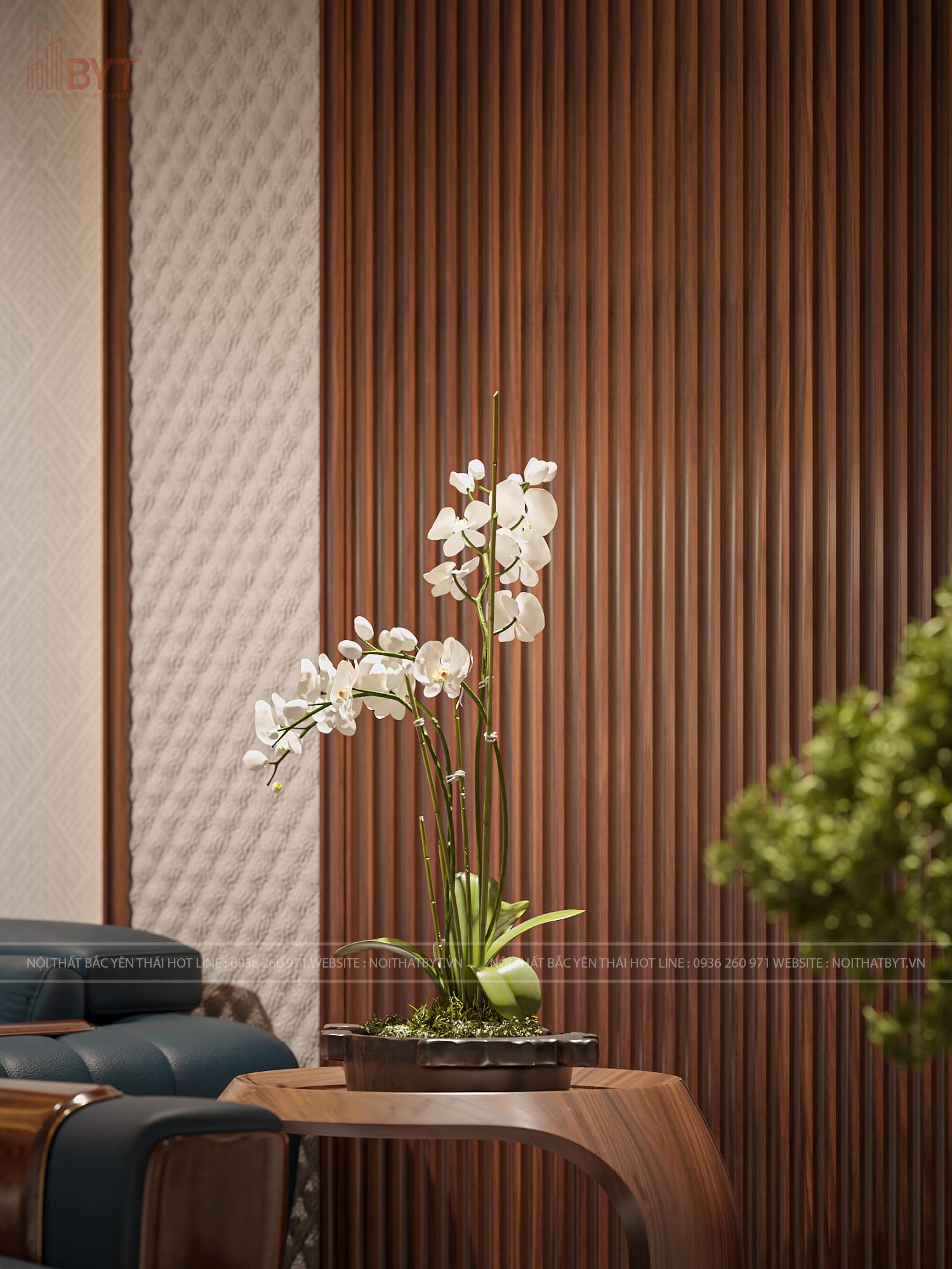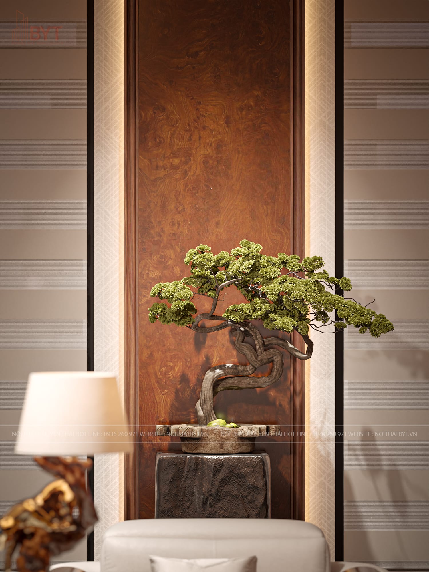 Một trong những yếu tố nổi bật của phòng khách này là cây bonsai nghệ thuật, được đặt trên bàn hoặc góc tường, tạo nên một không gian mang đậm hơi thở thiên nhiên. Ngoài ra, những loại cây nhỏ như hoa lan, cây lưỡi hổ hay bàng Singapore cũng được sử dụng để làm mềm không gian, giảm bớt sự cứng nhắc của các đường nét nội thất.