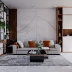 Nội thất phòng khách được thiết kế theo phong cách hiện đại, sử dụng chất liệu gỗ Melamin kết hợp đá hoa cương. Phòng khách hiện đại không chỉ tập trung vào sự tiện nghi mà còn đảm bảo tính thẩm mỹ cao. Sự kết hợp giữa gỗ tự nhiên, đá hoa cương và ánh sáng tự nhiên mang đến một không gian sống hài hòa, phù hợp với xu hướng sống hiện nay.