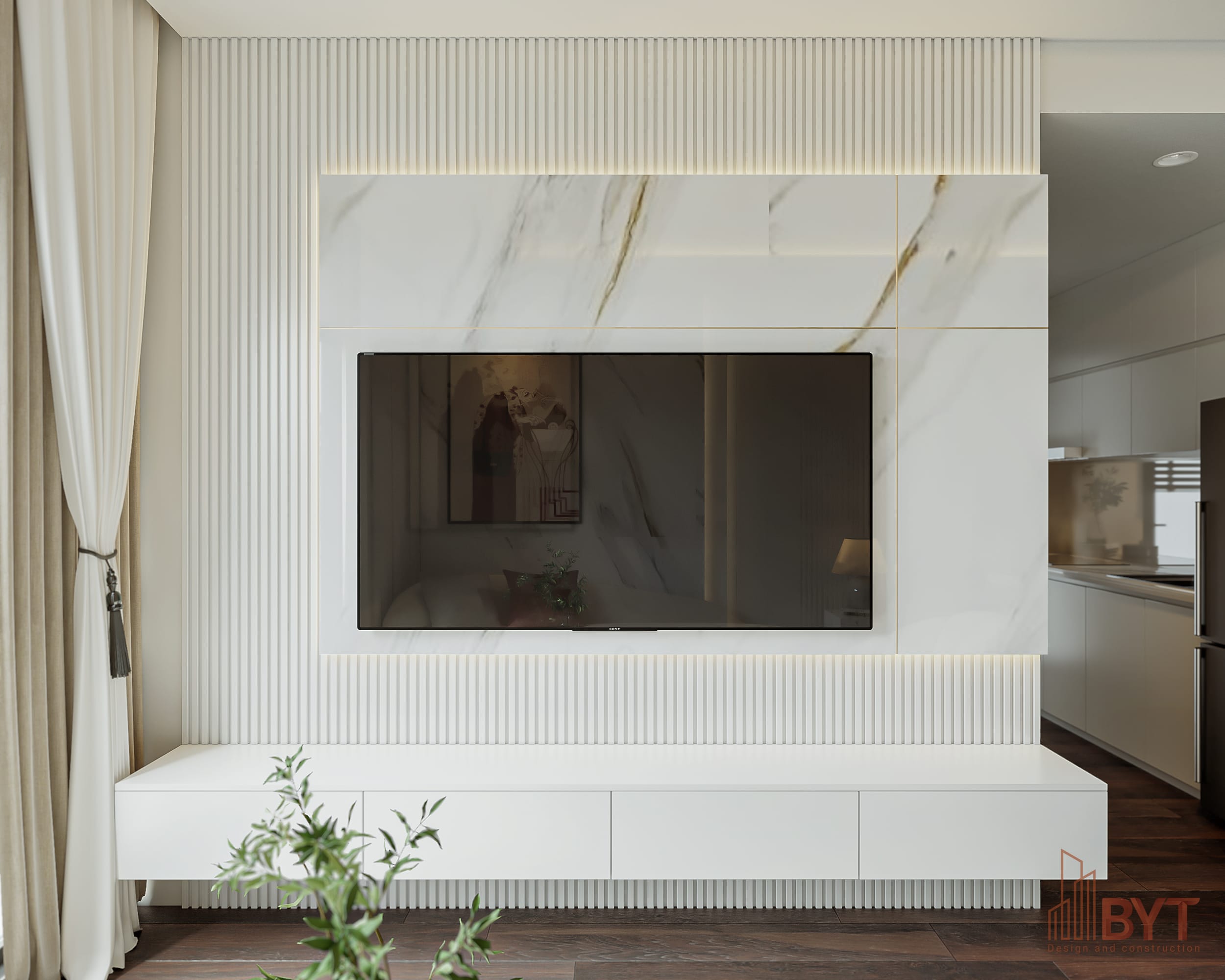 Kệ tivi treo tường với thiết kế hiện đại, sử dụng chất liệu gỗ sơn trắng và bề mặt đá bóng, giúp tối ưu diện tích và tạo điểm nhấn nổi bật cho căn phòng. Hệ thống đèn LED âm trần được bố trí khéo léo, tạo hiệu ứng ánh sáng dịu nhẹ, giúp tôn lên vẻ đẹp của từng chi tiết nội thất.