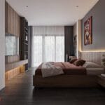 Tủ quần áo, giường ngủ và các chi tiết trang trí khác được thiết kế đồng bộ từ gỗ An Cường, mang lại cảm giác thống nhất và tinh tế cho căn phòng.
