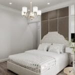 Phòng ngủ đầu tiên nổi bật với thiết kế ô cửa vòm từ khu vực giường ngủ tới khu vực thay đồ và tân trang. Cổng vòm là nét đặc trưng vốn có của phong cách tân cổ điển. Chi tiết này giúp không gian được chia thành các mảng, ô và sắp xếp một cách hài hòa, mang lại sự thanh thoát cho căn phòng. Tông màu trắng và xám nhạt thanh lịch kết hợp cùng các nội thất mạ đồng cấu trúc tinh xảo, tô thêm nét trang nhã và tinh tế cho căn phòng.