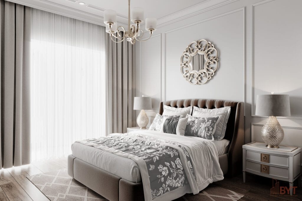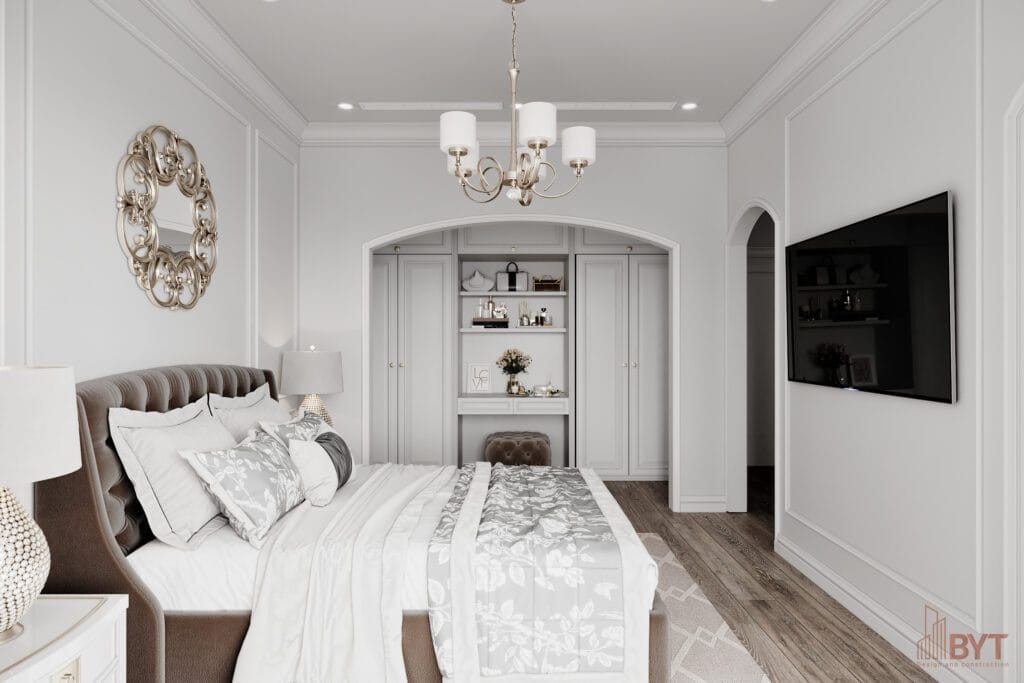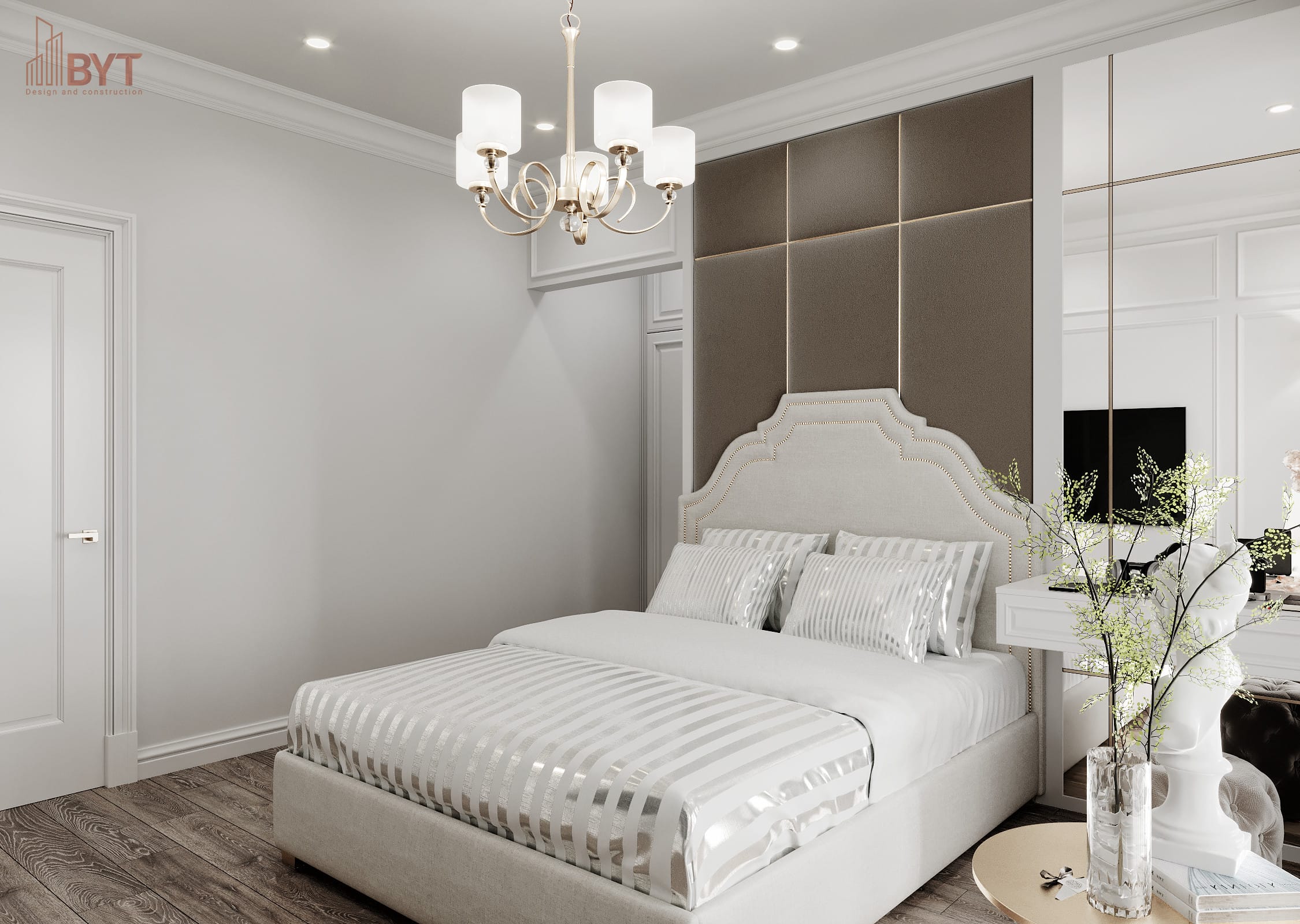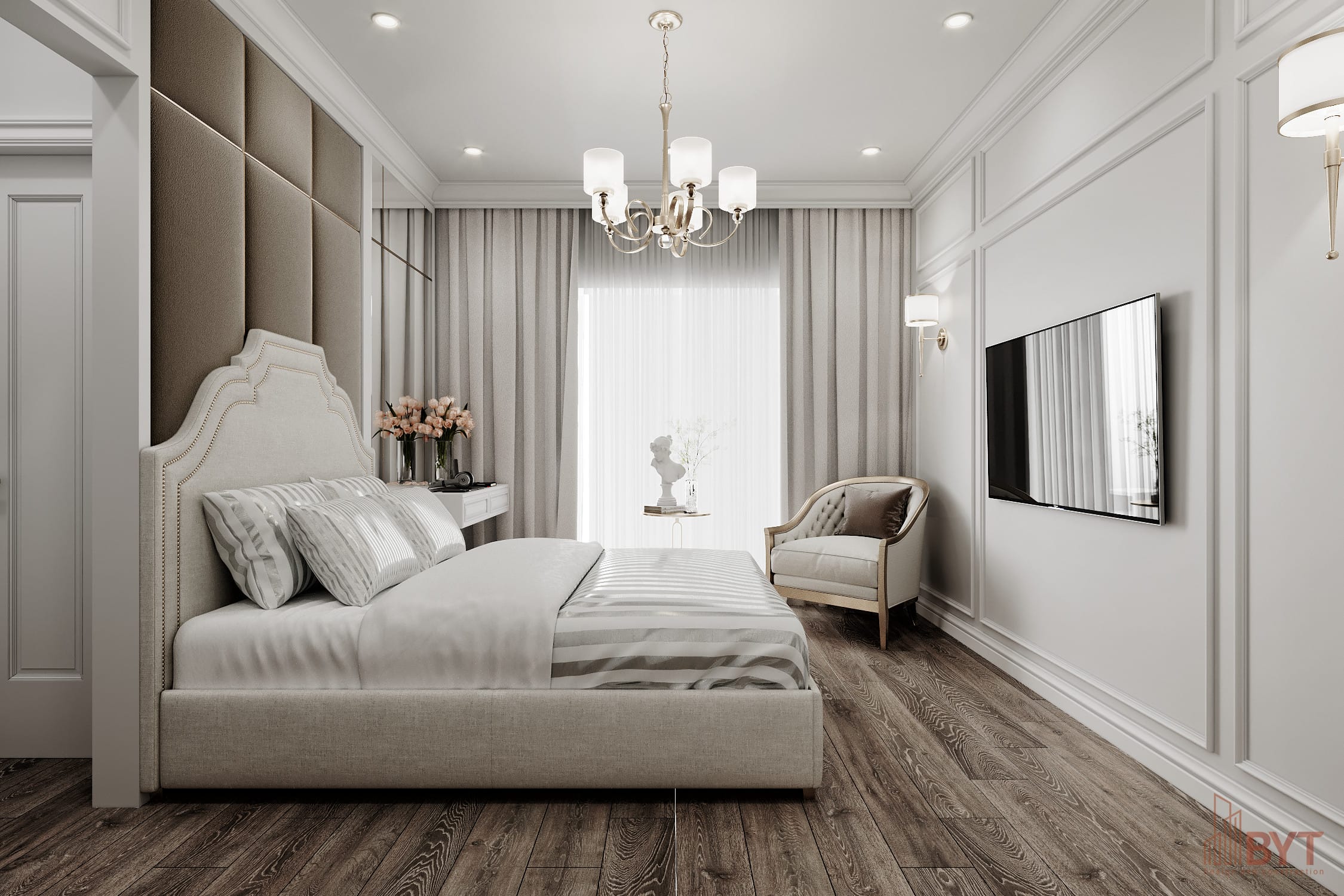 Khi thi công nội thất phòng ngủ cho dự án này, Nội thất BYT khéo léo kết hợp yếu tố hiện đại và cổ điển, mang đậm phong cách quý phái sang trọng mà không kém phần tiện nghi, thanh thoát. Mọi yếu tố được đặt vào không gian phòng ngủ một cách hợp lý, không thừa thãi, không rườm rà. Thiết kế này tạo nên một không gian sống chất lượng cho gia chủ, giúp gia chủ thoải mái tận hưởng sự riêng tư tuyệt đối, thư thái sau một ngày dài mệt mỏi.
