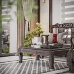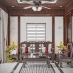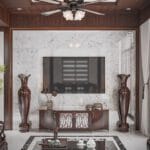 Phòng khách mang đậm phong cách Á Đông, kết hợp hài hòa giữa nét sang trọng truyền thống và tiện nghi hiện đại, tạo nên không gian ấn tượng và đẳng cấp.