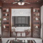 Trần nhà được thiết kế với các đường phào chỉ gỗ kết hợp hoa văn tinh xảo, tạo chiều sâu và sự nổi bật cho không gian. Đèn quạt trần vừa mang tính thẩm mỹ vừa tăng cường tiện ích cho phòng khách, với ánh sáng vàng dịu nhẹ, làm nổi bật nét sang trọng của nội thất gỗ.