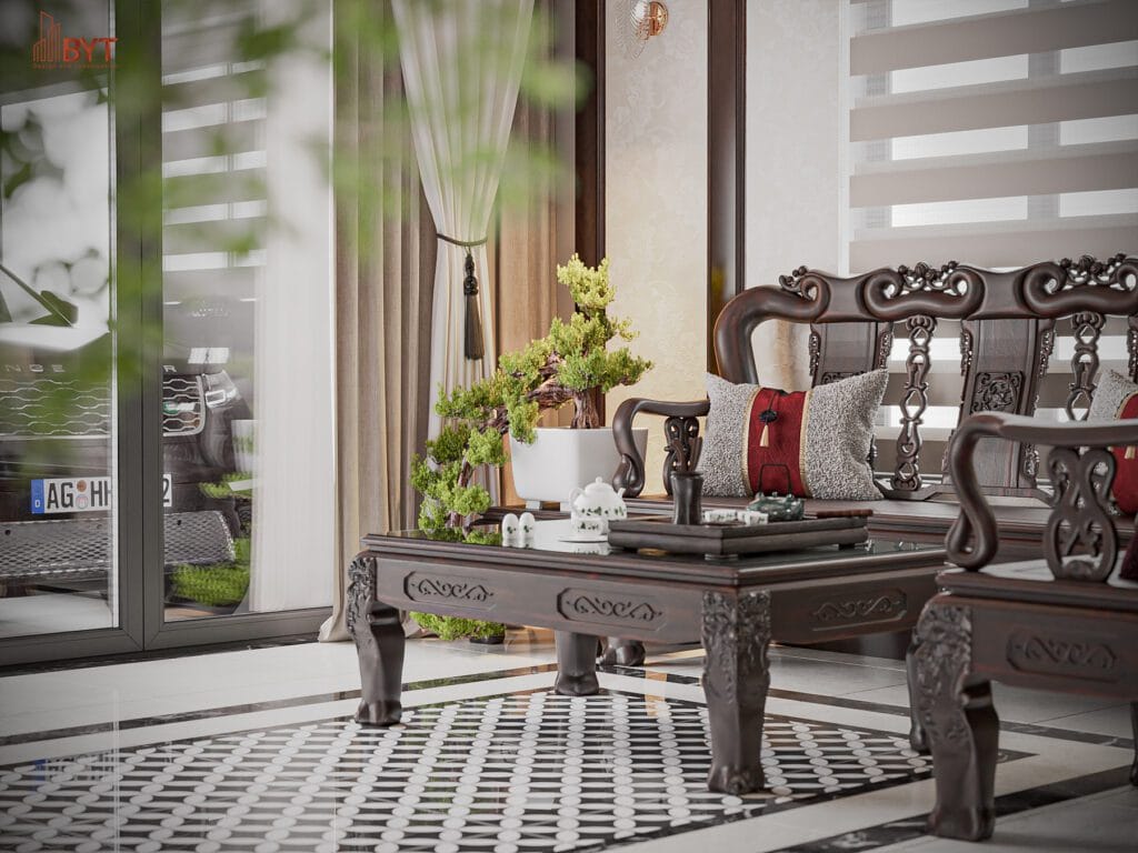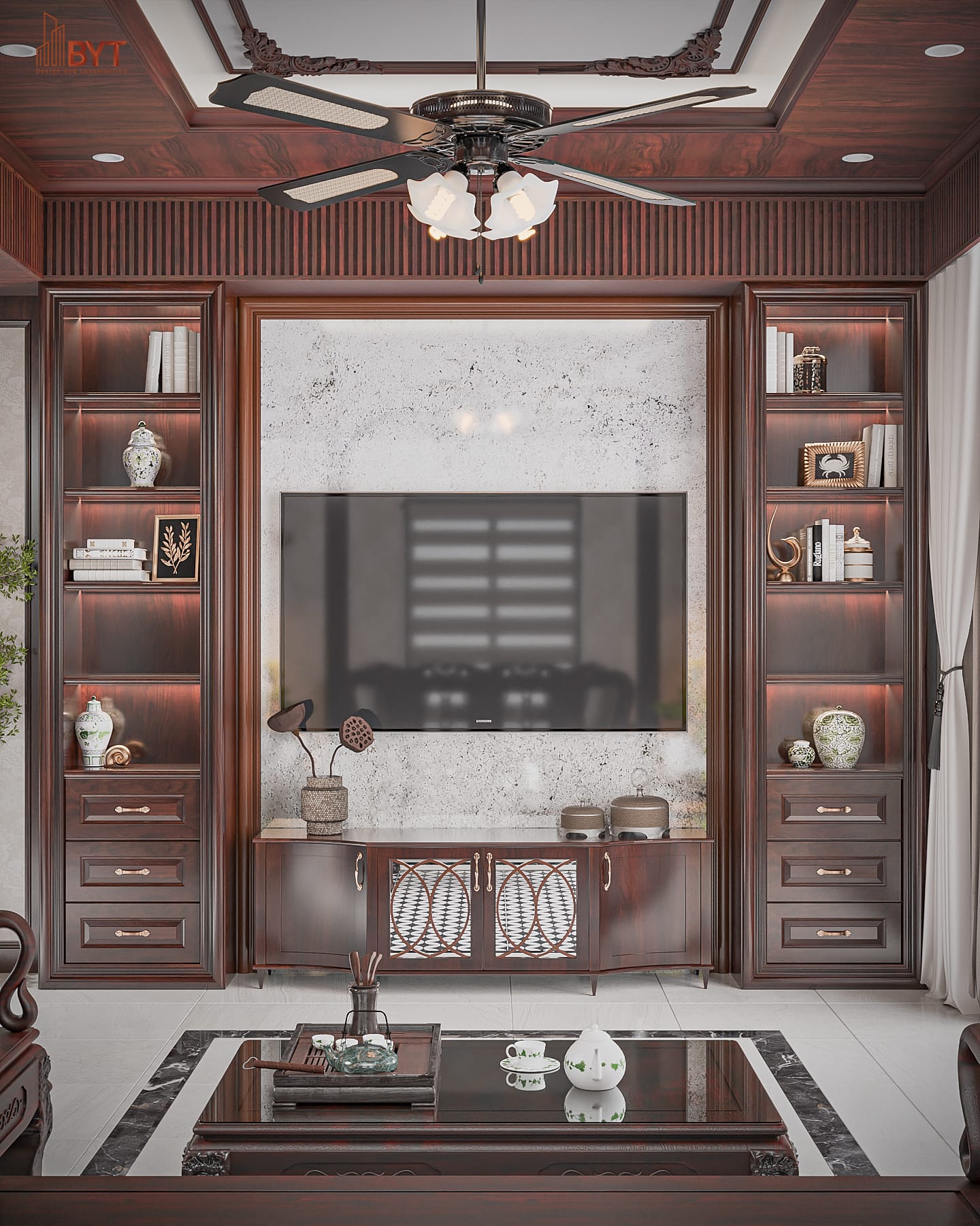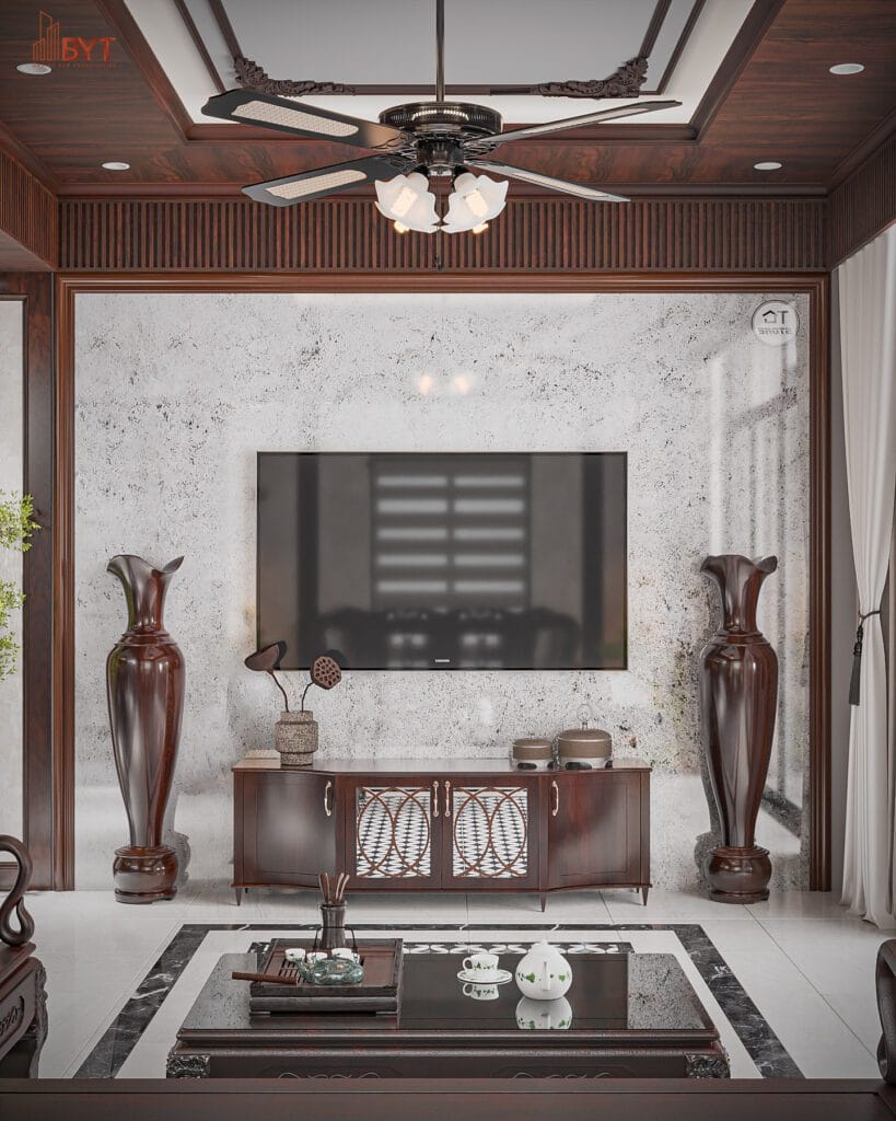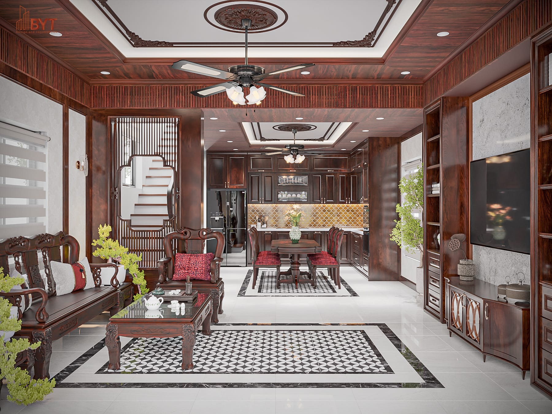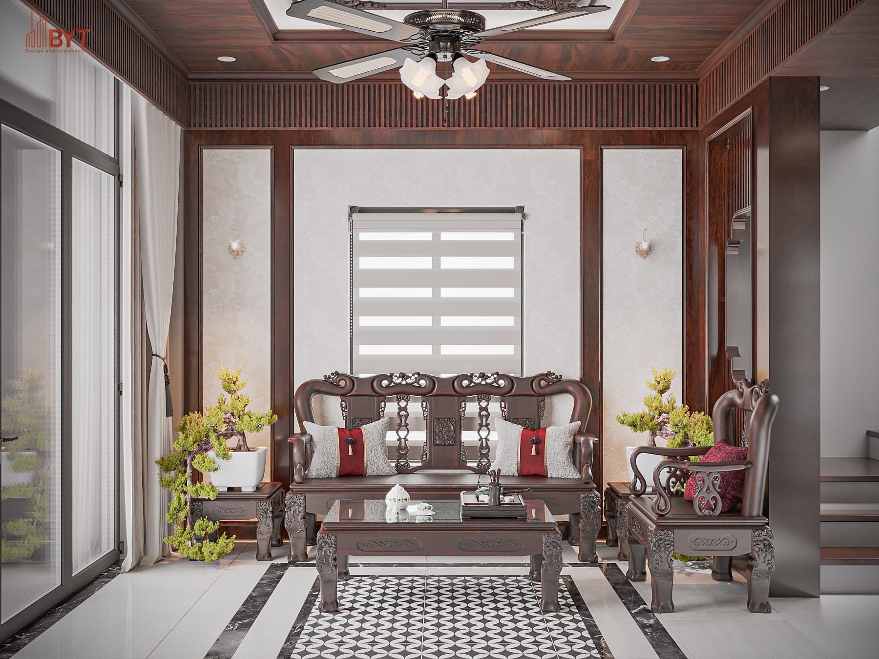 Phòng khách mang đậm phong cách Á Đông, kết hợp hài hòa giữa nét sang trọng truyền thống và tiện nghi hiện đại, tạo nên không gian ấn tượng và đẳng cấp.