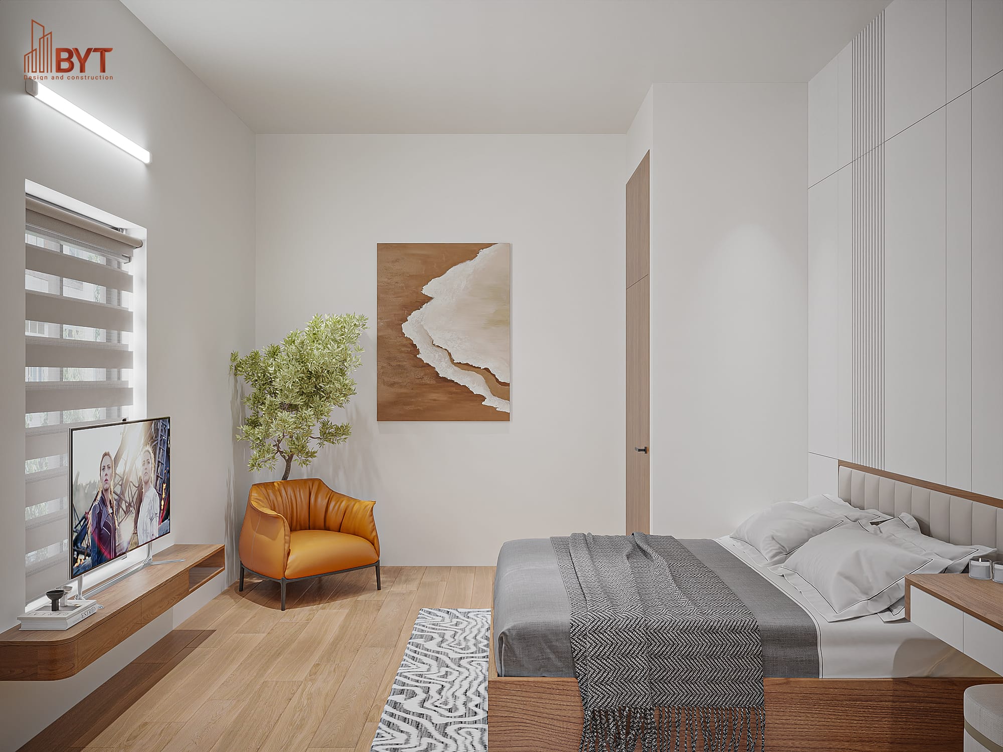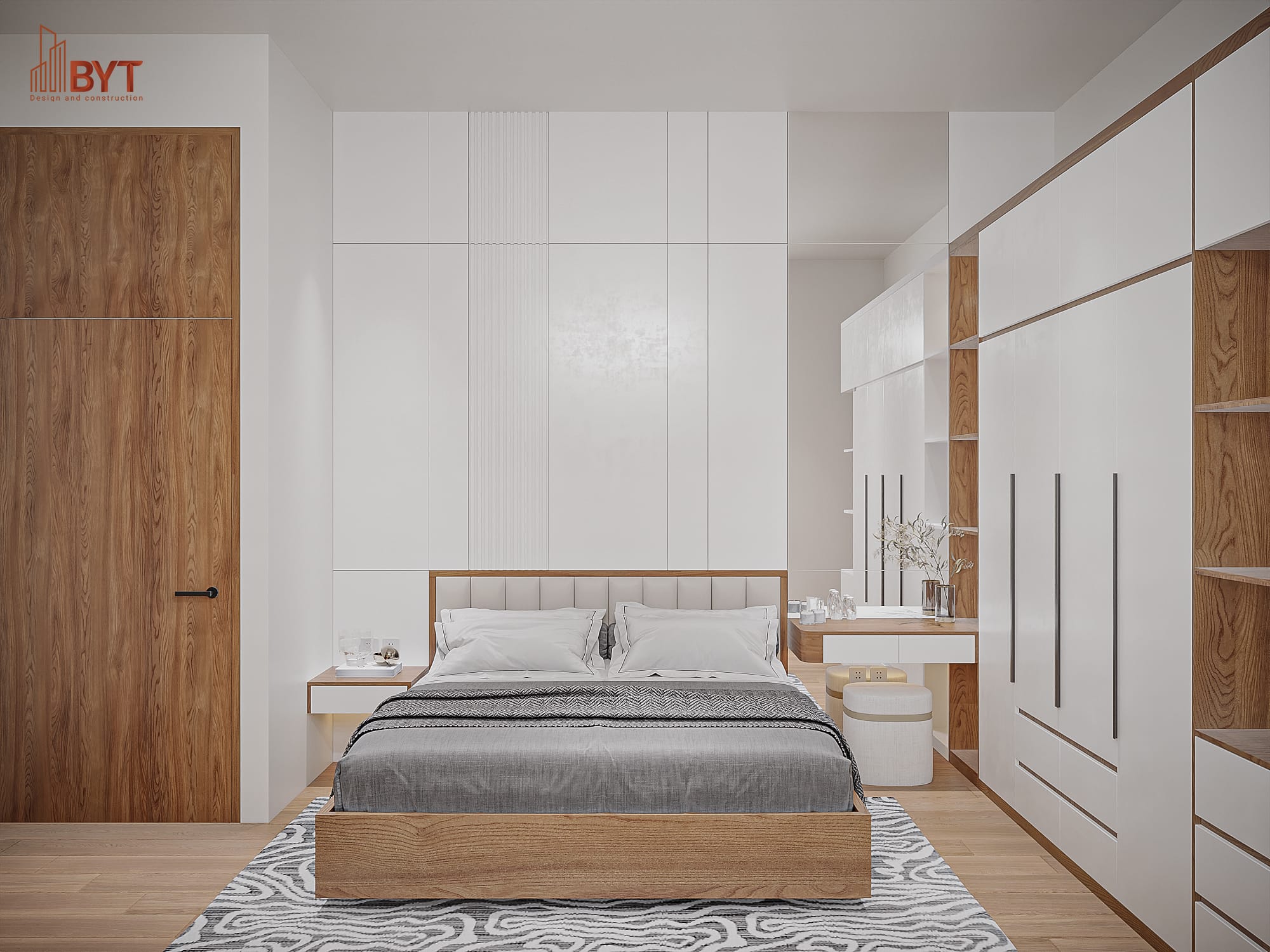 Khác với sự đầu tư chỉn chu vào nội thất phòng khách, phòng ngủ có phần đơn giản hơn.Nội thất phòng ngủ được thiết kế theo phong cách hiện đại, tối giản, với tone màu trung tính nhẹ nhàng và không gian được sắp xếp khoa học, mang lại cảm giác thư giãn và thoải mái.