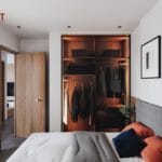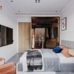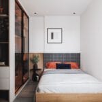 Tuy vậy, Nội thất BYT vẫn thiết kế một số chi tiết giúp căn phòng thêm nổi bật. Tủ quần áo kính trong được thiết kế âm tường giúp căn phòng thêm gọn gàng. Ánh sáng vàng được bố trí trong tủ để tủ có độ sâu, tăng diện tích cảm nhận cho tổng thể căn phòng. Phòng ngủ lớn được đặt thêm một chiếc sofa hiện đại bọc nỉ màu nâu cam cùng đèn đọc sách cao tạo không gian thư giãn riêng tư.