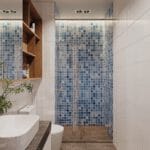 Đặc biệt, khu vực tắm được ngăn cách bằng cửa kính trong và trang trí bằng tường đá xanh mát giúp người sử dụng cảm nhận được sự sạch sẽ, gia tăng sự thích thú cho trẻ nhỏ. Sàn vệ sinh được lựa chọn kỹ lưỡng với kết cấu đặc biệt giúp hạn chế nước tồn đọng gây trượt trượt và ẩm mốc.