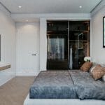 Phòng ngủ được thiết kế theo phong cách tối giản với tông màu trắng và xám nhạt, mang lại không gian nghỉ ngơi thư thái. Khác với không gian sinh hoạt chung, phòng ngủ được phối thêm màu nâu nhẹ nhàng giúp căn phòng thêm ấm áp và lãng mạn. Giường ngủ lớn, bọc nệm mềm mại cùng bộ chăn ga cao cấp tạo nên cảm giác thoải mái và dễ chịu. Hệ tủ quần áo âm tường kết hợp cửa kính tráng gương là điểm nhấn, vừa sang trọng vừa giúp tối ưu diện tích phòng.