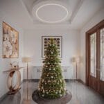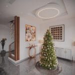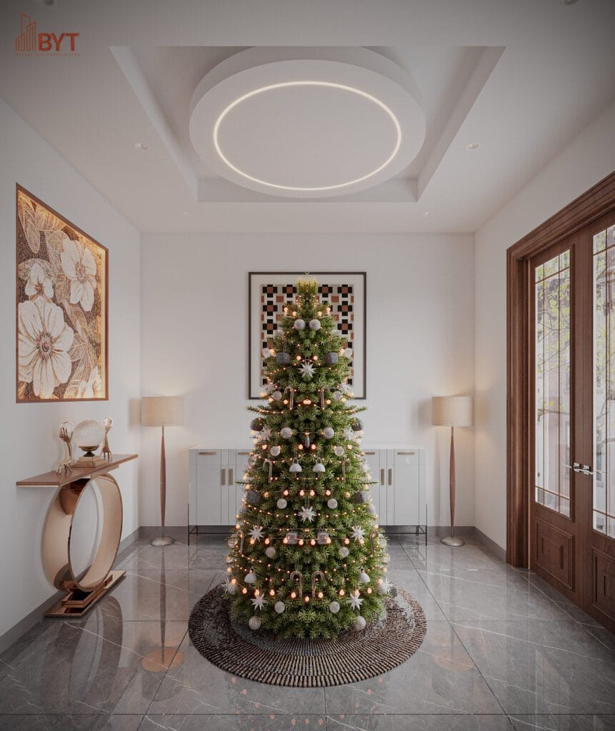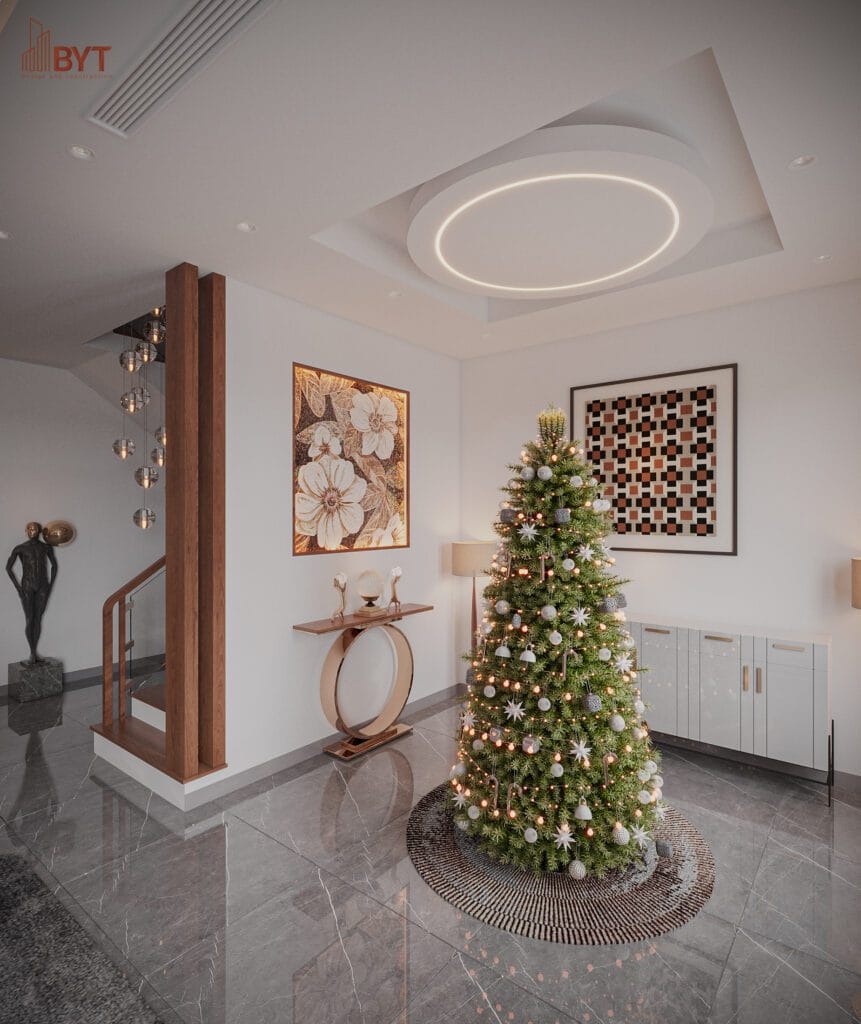 Ngay từ khi bước tới căn nhà, bạn sẽ nagy lập tức ấn tượng với cửa chính với thiết kế cửa gỗ phối kính cánh đẩy lịch sự và sang trọng. Khu vực sảnh ngay tại cửa chính cũng được đầu tư nội thất trang chí với cây thông Noel rực rỡ, tạo không khí ấm áp và mùa lễ hội, tranh trang chí và tủ kệ để giày gọn gàng. Tất cả đều có một điểm chung chính là có màu sắc ấm nóng, chất liệu đồng hoặc gỗ sang trọng.