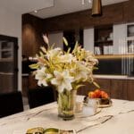 Phòng bếp được bố trí gọn gàng với tủ bếp bằng gỗ và mặt bàn bếp bằng đá nhân tạo, có hoa văn tinh tế. Sự kết hợp giữa gỗ tối màu và đá trắng xám giúp không gian bếp trở nên hiện đại, dễ lau chùi và bền bỉ. Tủ bếp trên và dưới đều được thiết kế với các ngăn kéo thông minh, tối ưu hóa không gian lưu trữ và tiện ích cho người sử dụng.