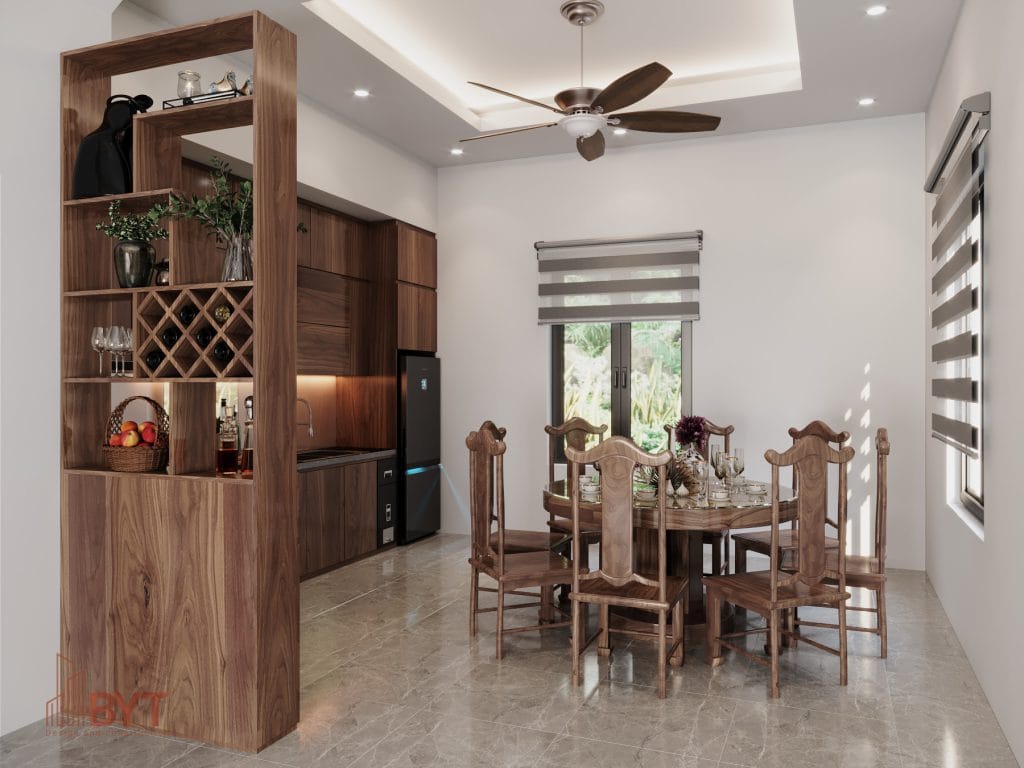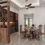Thiết kế nội thất phòng bếp trong không gian này tối ưu hóa khả năng lưu trữ với các kệ, tủ và khu vực để đồ thông minh. Việc bố trí các khu vực lưu trữ gọn gàng và hợp lý giúp không gian trở nên ngăn nắp, tiện dụng và dễ dàng sử dụng. Các món đồ nội thất như kệ rượu, tủ đựng đồ ăn hay kệ gia vị đều được sắp xếp một cách khoa học, mang lại sự tiện lợi trong quá trình nấu nướng và sử dụng hàng ngày.