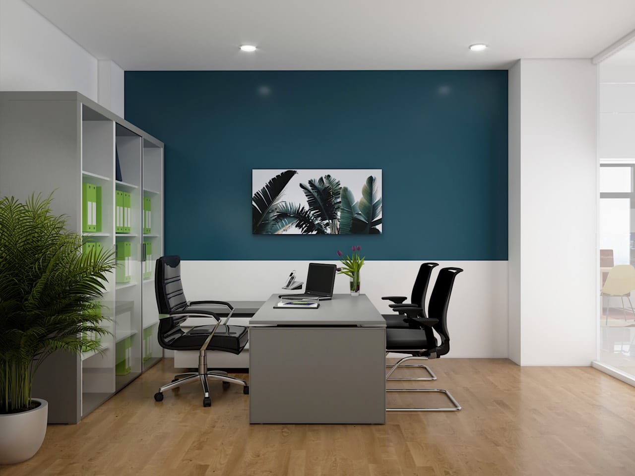 Phòng giám đốc có thiết kế sang trọng với tông màu xanh đậm và bàn làm việc lớn, cùng với các tủ kệ lưu trữ tài liệu được sắp xếp gọn gàng. Phòng được bố trí đơn giản nhưng không kém phần tinh tế, tạo không gian riêng tư, trang nghiêm nhưng vẫn thân thiện. Các chi tiết trang trí như tranh nghệ thuật và cây xanh làm điểm nhấn, tạo nên sự cân bằng giữa công việc và thư giãn.