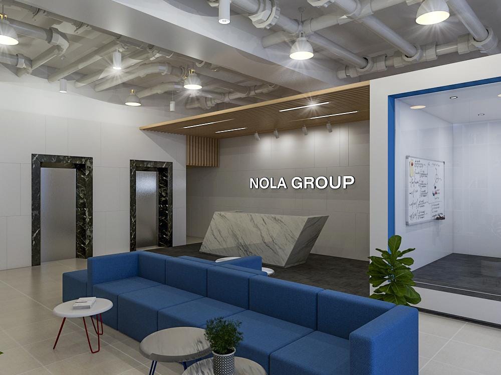 Ấn tượng đầu tiên khi bước ra từ cửa thang máy chính là chúng ta có thể ngay lập tức thấy được logo của tập đoàn Nola Group được thiết kế dạng đèn LED treo tường nổi bật. Phía dưới là quầy lễ tân dạng bàn đá nguyên khối. Tuy được thiết kế tối giản nhưng khu vực quầy lễ tân đã thành công mang lại cảm giác chuyên nghiệp ngay từ khi bước vào. Phía ghế chờ là ghế băng lớn với màu thương hiệu của công ty cùng bàn trà nhỏ. Khu vực chờ này được thiết kế rộng rãi và êm ái, tạo cảm giác thoải mái, thân thiện cho người chờ đợi.