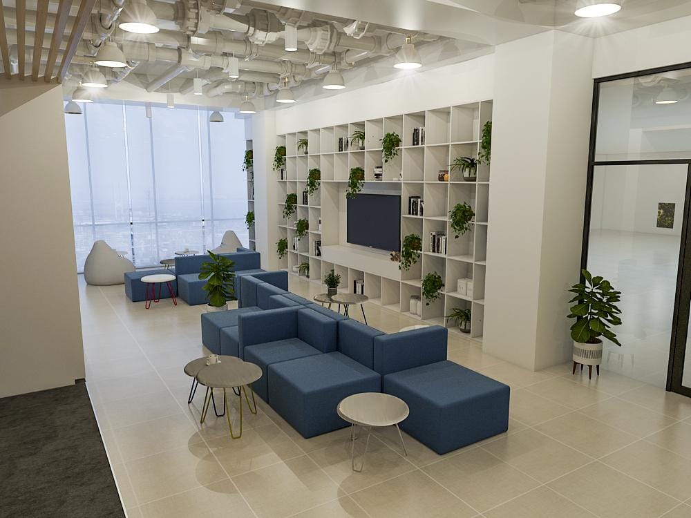 Không gian thư giãn là nơi nhân viên có thể tạm nghỉ ngơi, nạp lại năng lượng sau giờ làm việc căng thẳng. Thiết kế khu vực này bao gồm ghế sofa dài, gối tựa lưng, bàn trà, và các mảng xanh tạo cảm giác tươi mát. Ngoài ra, các giá sách được bố trí hợp lý giúp nhân viên có thể đọc sách, giải trí trong giờ nghỉ. Màu sắc xanh dương và xanh lá được sử dụng làm chủ đạo, tạo nên bầu không khí thư giãn, dễ chịu và trẻ trung.