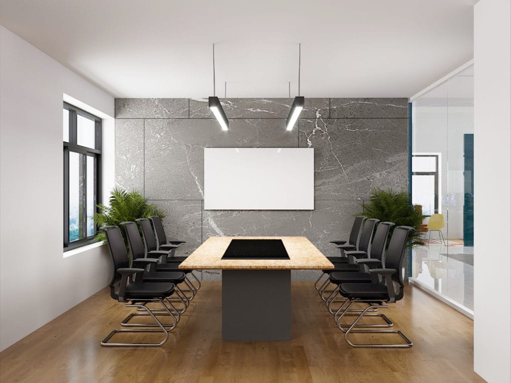 Nội thất cơ bản của phòng họp bao gồm bàn họp dài với khe đặt cổ cắm thiết bị điện tiện dụng, ghế văn phòng tiêu chuẩn và bảng trắng kiêm màn chiếu hỗ trợ tốt quá trình trao đổi và đàm phán. Để gia tăng sự tập trung trong không gian phòng họp thì không có màu sắc nào quá nổi bật được sử dụng ở đây, hoạt tiết chủ yếu là marble của mặt bàn và đá ốp tường để tránh đơn điệu. Bên cạnh đó thì cây xanh cũng được bố trí ở góc phòng để tạo cảm giác thoải mái, tránh ngột ngạt.